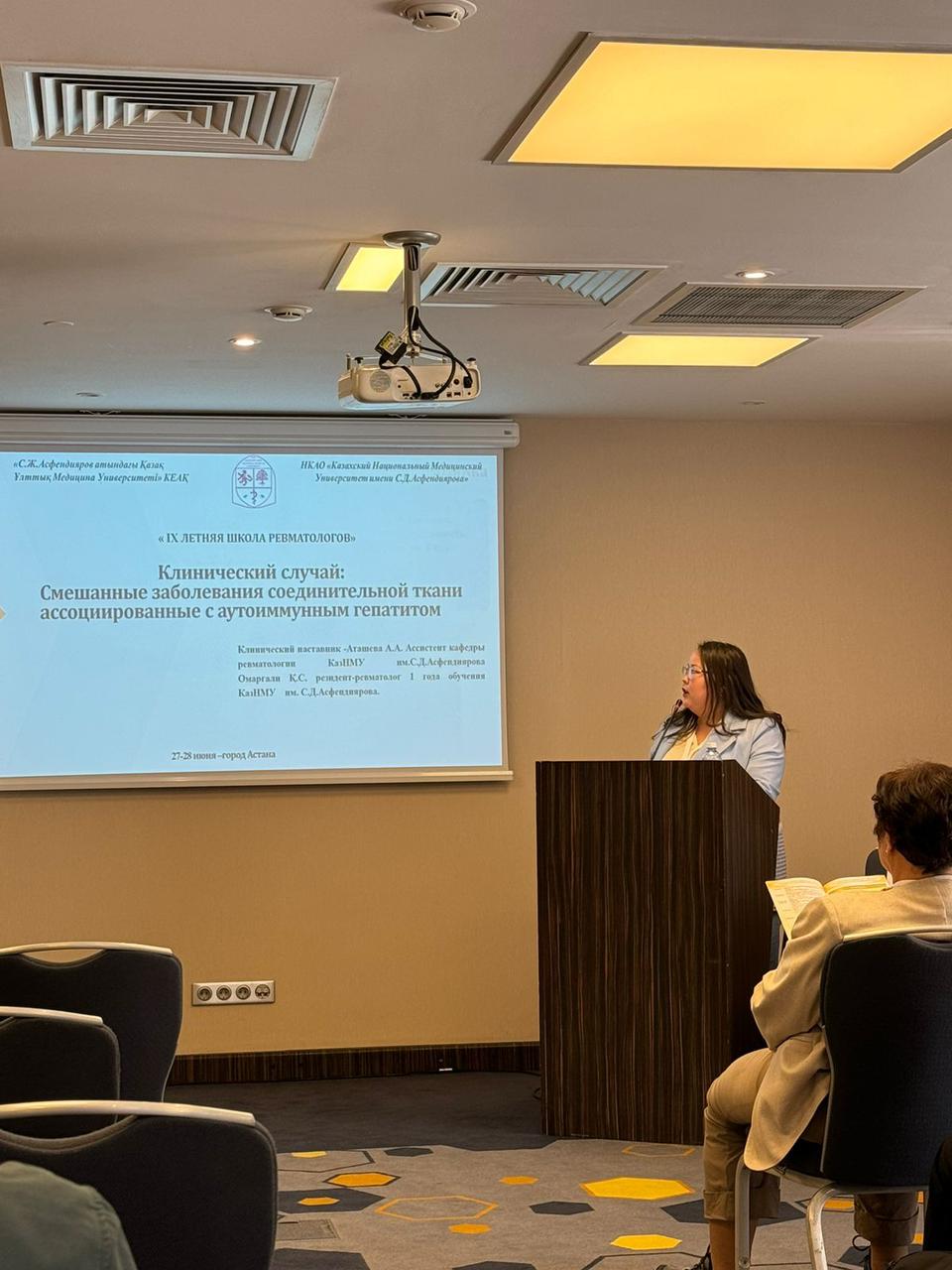 На данной конференции резиденты кафедры ревматологии представили клинические случаи по системной красной волчанке – резидент 1 года Сәтім О.Қ., Кәрібай С.; смешанные заболевание соединительной ткани – Омарғали К.С., гранулематозу с полиангиитом –Даулетбаева Д., Сейдахмет А. Применение цифровых инструментов в ревматологии – Сатим О.К.. Выступления отличались клинической зрелостью, аргументированным подходом к диагностике и лечению, а также активным участием научных и клинических наставников в обсуждении представленных материалов.