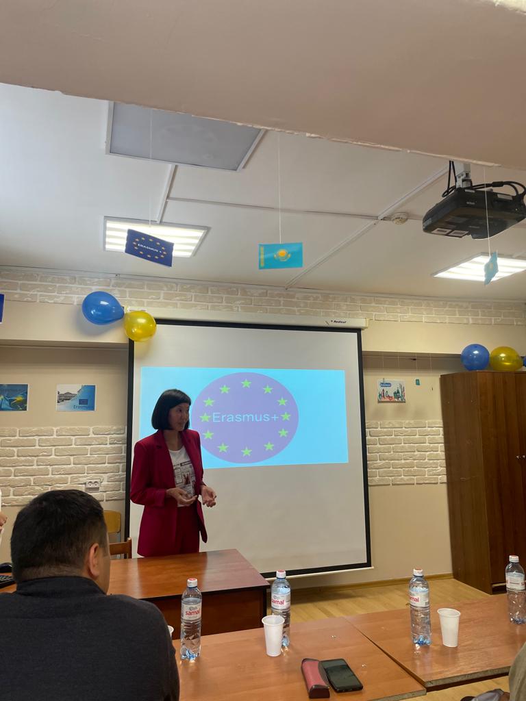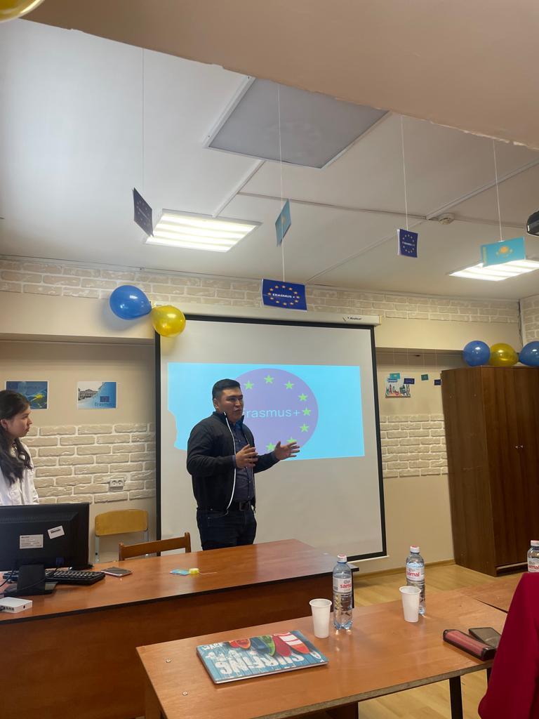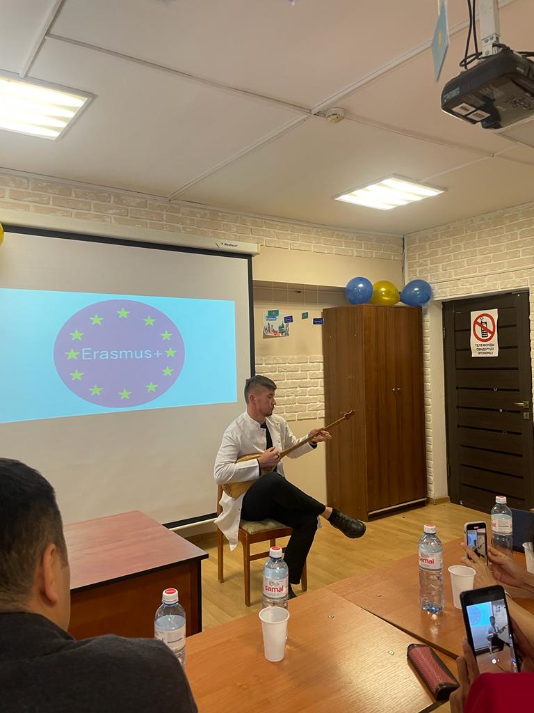 According to the scenario of the event, presentations were provided in Kazakh and English, where students of the OZ19-001-1 group Yerbulatova G., Sabit M. demonstrated various opportunities of the Erasmus+ program, including for Kazakhstan: capacity building in higher education, Erasmus Mundus , international mobility and the Jean Monet program.